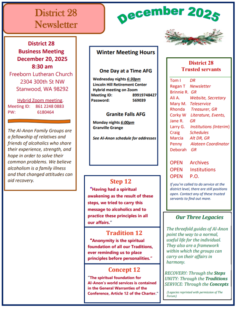 Al-Anon is a worldwide fellowship that offers a program of recovery for the families and friends of alcoholics, whether or not the alcoholic recognizes the existence of a drinking problem or seeks help. Members give and receive comfort and understanding through the mutual exchange of experience, strength and hope.  We hope you find in this fellowship the help and friendship we have been privileged to enjoy.  Sharing is protected by a tradition of anonymity.  Al-Anon is not a religious organization or a counseling agency.  No dues or fees are required.  Membership is voluntary, requiring only that one’s own life has been adversely affected by someone else’s drinking problem.