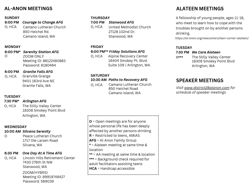 Schedules ANNOUNCEMENT: Wednesday night One Day at a Time AFG has moved from 7:00pm to 6:30pm. Same location: Lincoln Hills Retirement Center or Zoom ANNOUNCEMENT: Monday night Granite Falls AFG has moved from 7:00pm to 6:00pm. Same location: Granville Grange >>>Click here for printable meeting schedule<<< Share this: Share on X (Opens in new window) X Share on Facebook (Opens in new window) Facebook Like Loading...